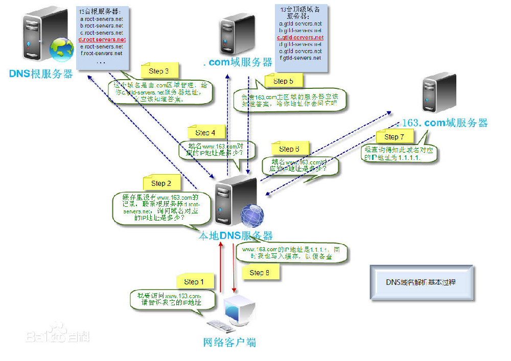 步骤3 :根服务器返回由. com区域管理的域名,本地域名服务器返回要联系的gTLDServer地址。 GLD是国际顶级域名服务器,如. com/.cn/.org,全球只有13台左右。