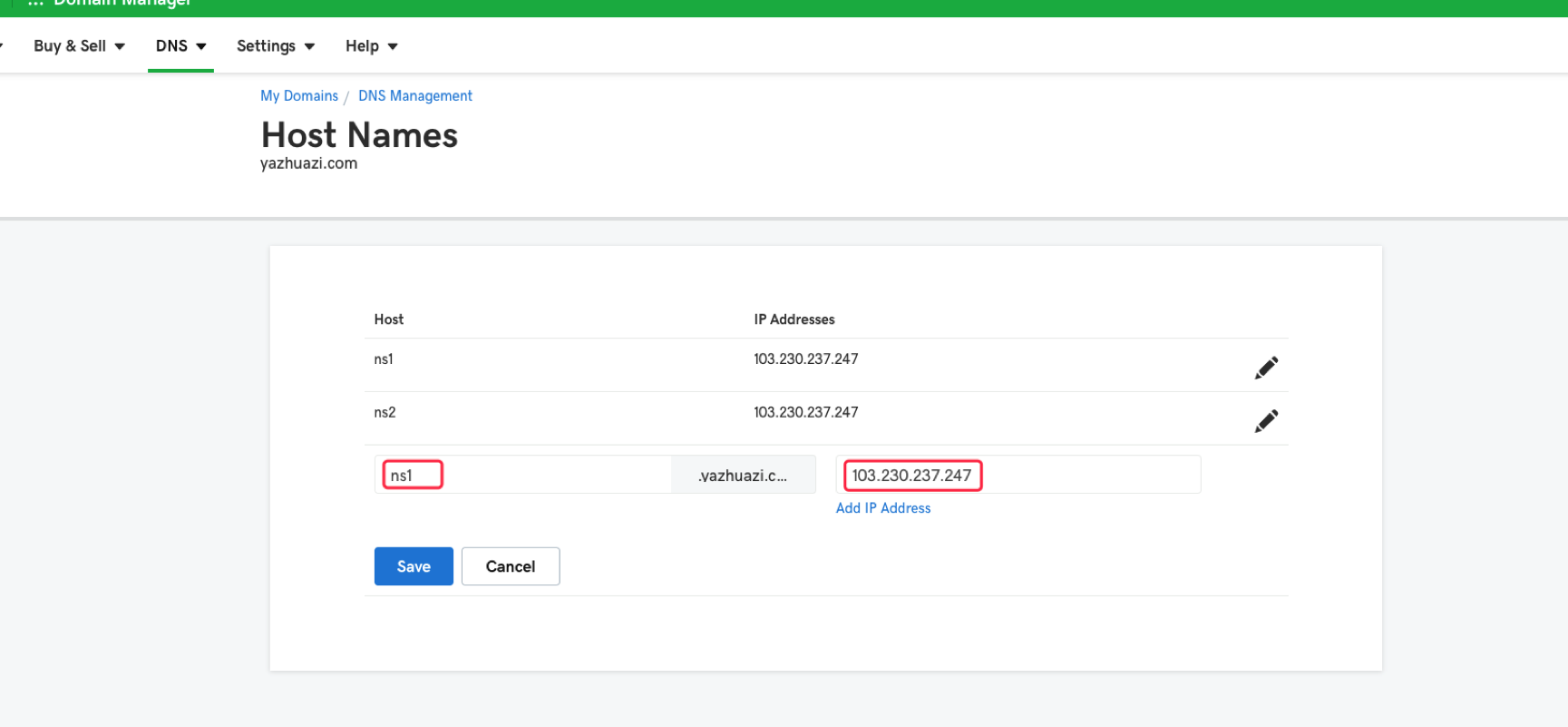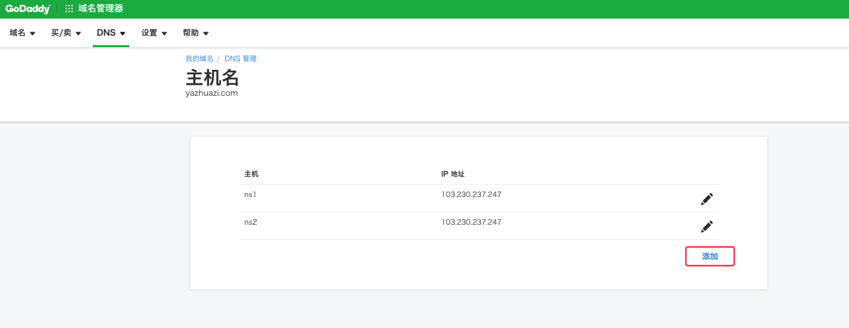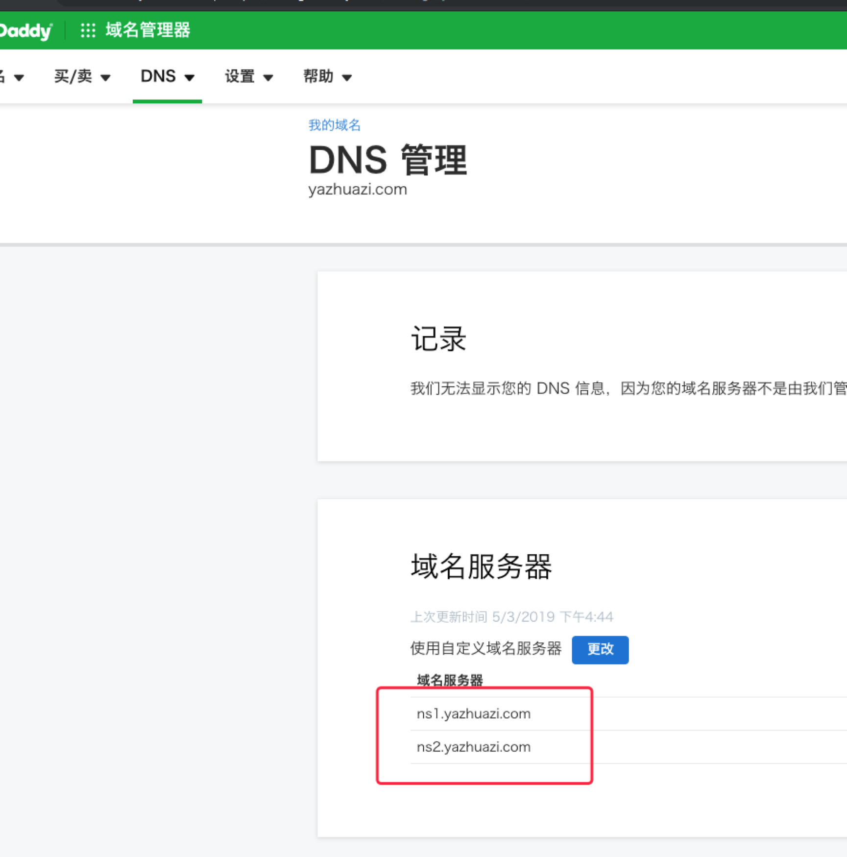 有Godaddy的域名yazhuazi.com,我们希望构建DNS域名服务以用于其他域名,如ns1.yazhuazi.com和ns2.yazhuazi.com